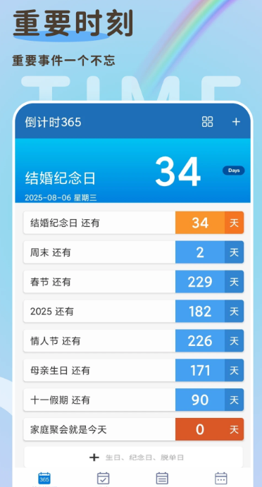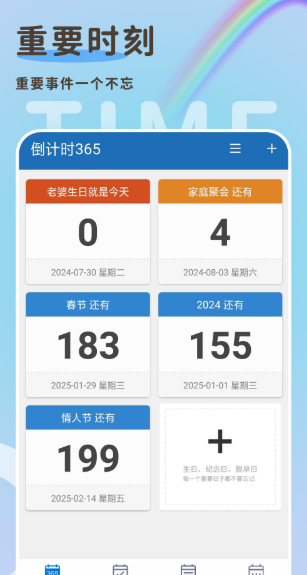 倒计时365app 具有非常强大的功能,涵盖了各种时间记录功能。支持倒计时日、倒计时日、纪念日、生日等多种记录方式,并具有提醒功能。它能让你在网上轻松记录生活中重要的日子。操作简单方便,满足不同用户的使用需求,给大家带来更多的便利。帮助用户在来年轻松计划和跟踪重要事件、纪念日或目标实现时间。直观友好的界面设计,让每一天的倒计时都变得有趣又充满动力。
